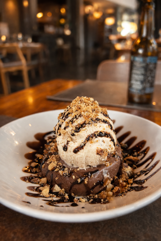 Para finalizar a refeição, escolhi a sobremesa assinatura da casa: brigadeiro com sorvete de paçoca, pralinê e calda de chocolate.